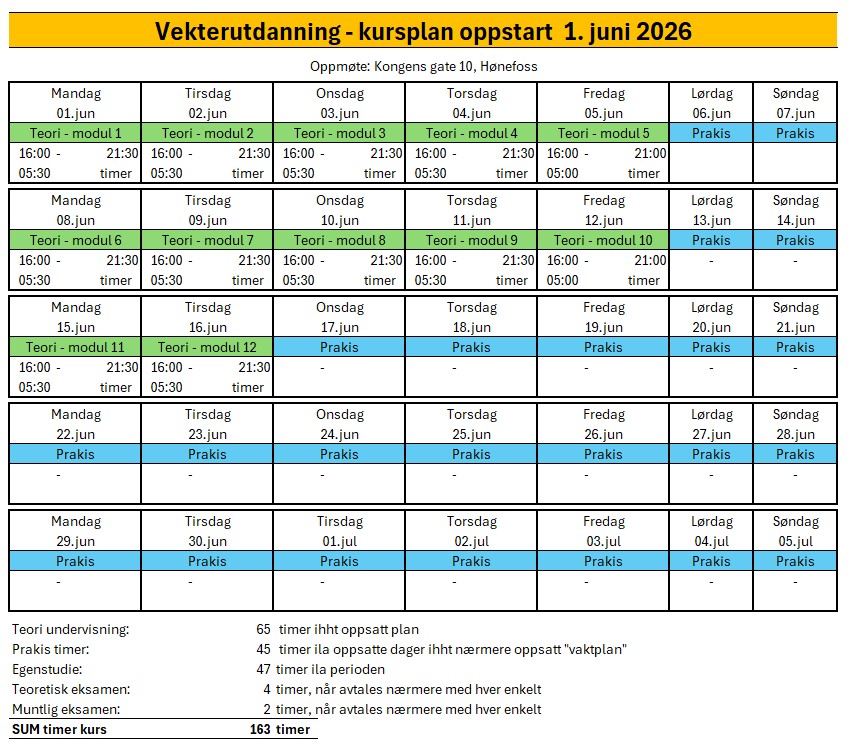 Vår utdanning vil gi deg ferdighetene du trenger for å jobbe som vekter hos oss i Hønefoss Vaktselskap og andre vaktselskaper. Som vekter kan du også jobbe som ordensvakt på utesteder og arrangementer. Utdanningen gjennomføres som klasseromsundervisning, gruppearbeid, egenstudium og praksis.